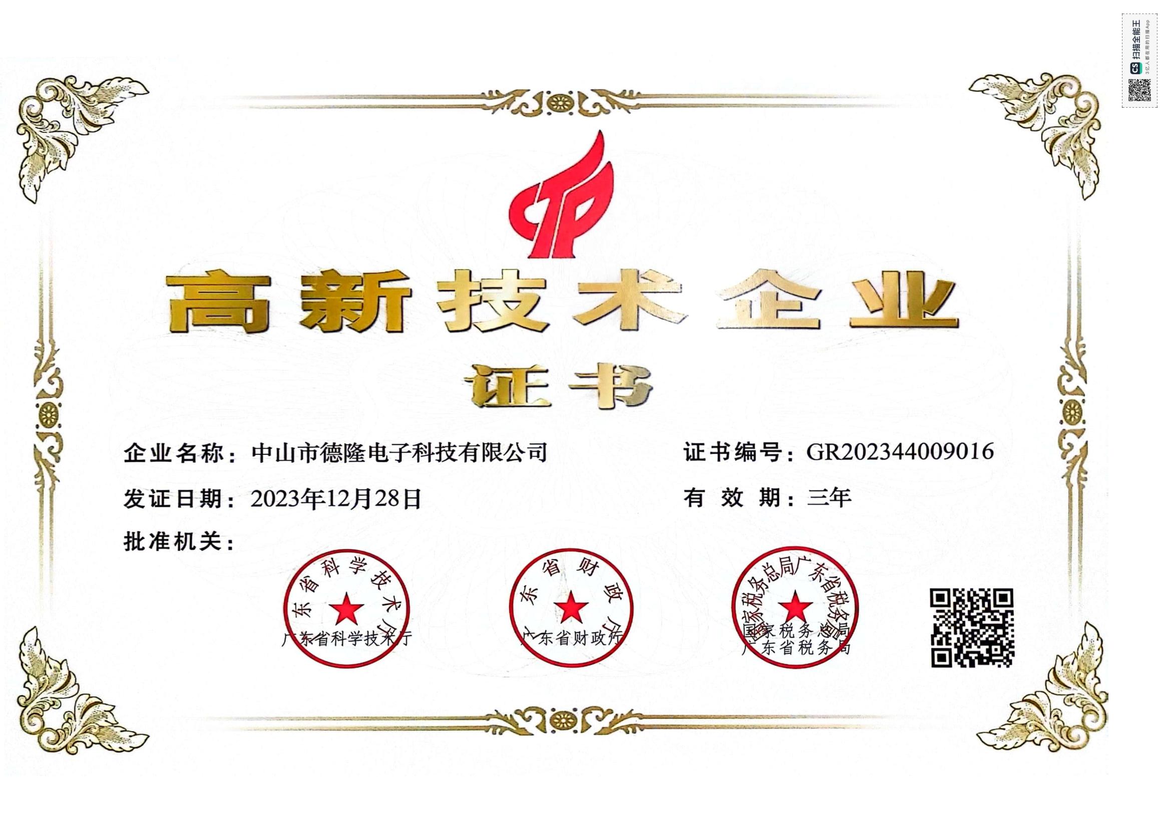 高新技术企业证书